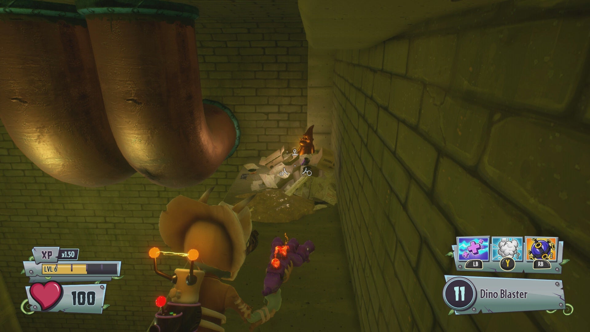 Gold Gnome #5 - In the sewers, locate a narrow footpath that connects two platforms. Look across the gap toward a pair of copper pipes on the far wall. There is a Gold Gnome in the left corner just behind the pipes. To access this gnome, you must play as a character that can clear the gap, such as the Scientist or Citron.