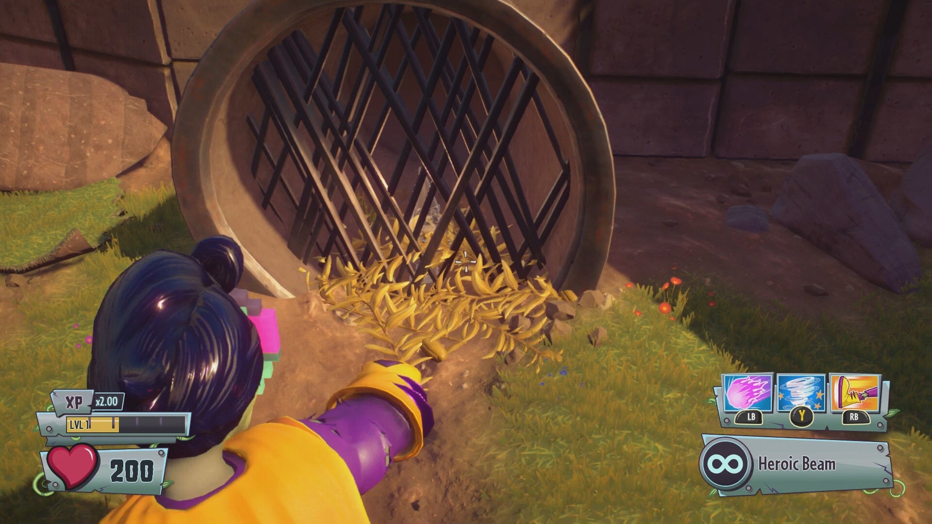 Gold Gnome #9 - Once you have completed the main Hero quests for the plants, return to Davebot’s garage. Go down the passage beneath the parked car. Just before heading through the gold double doors, look along the wall to the left near the water. There is another mushroom button along the stone wall. Shoot the button, and a Gold Gnome will pop up beside the bridge.