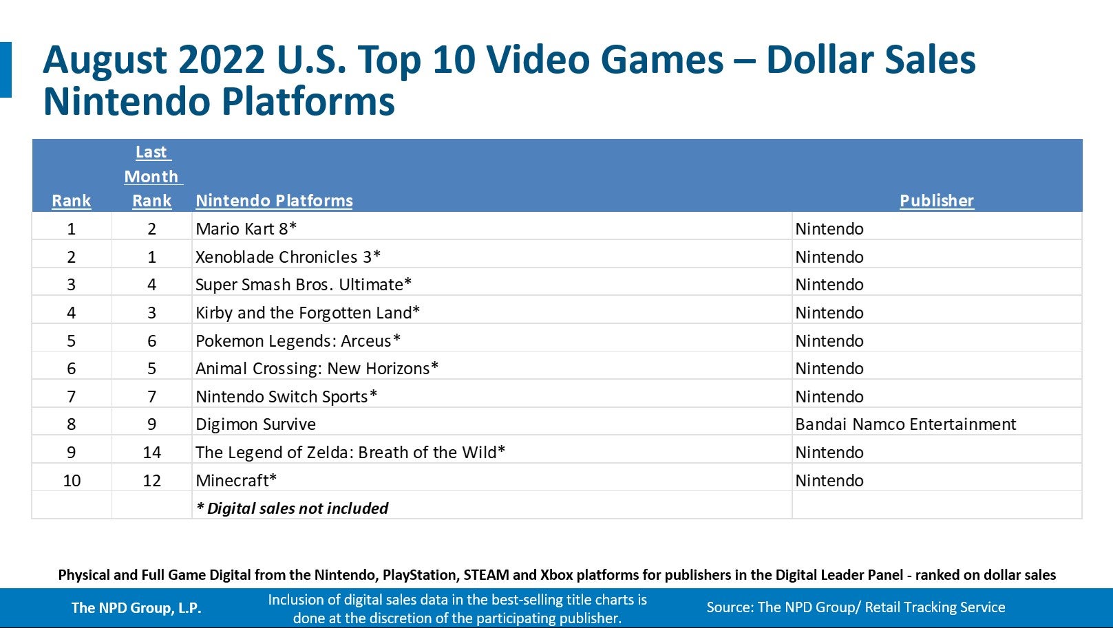 The NPD Group has released its August 2022 report covering video game hardware, software, and accessory sales in the US.