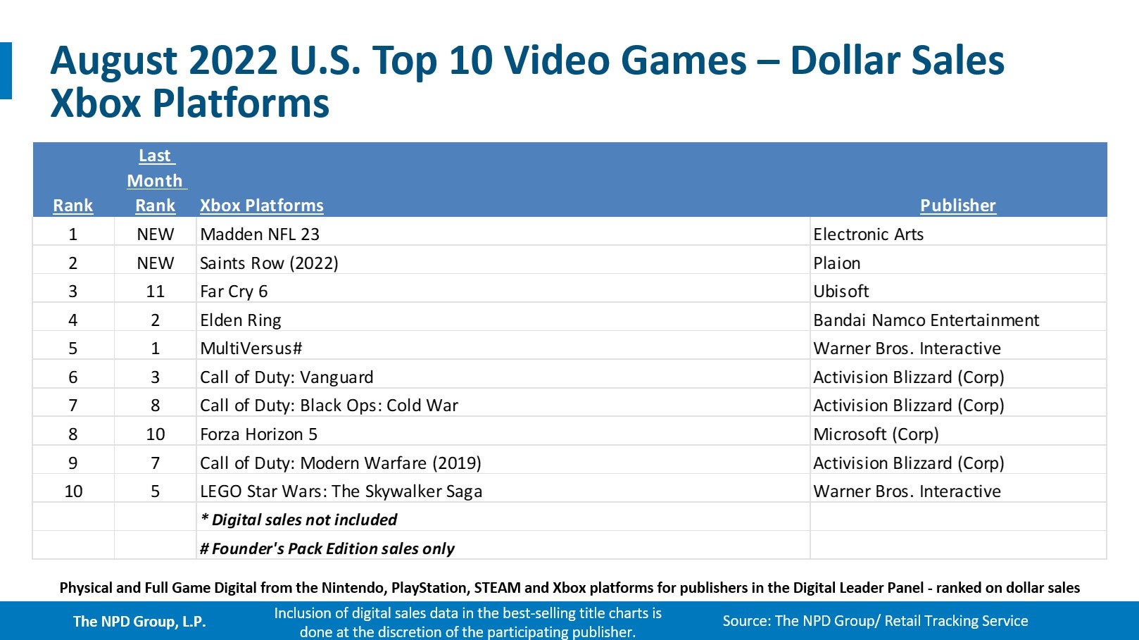 In software, Madden NFL 23 debuted as the best-selling game of August, and is the 23rd consecutive year that a Madden title was the best-selling game of its launch month.