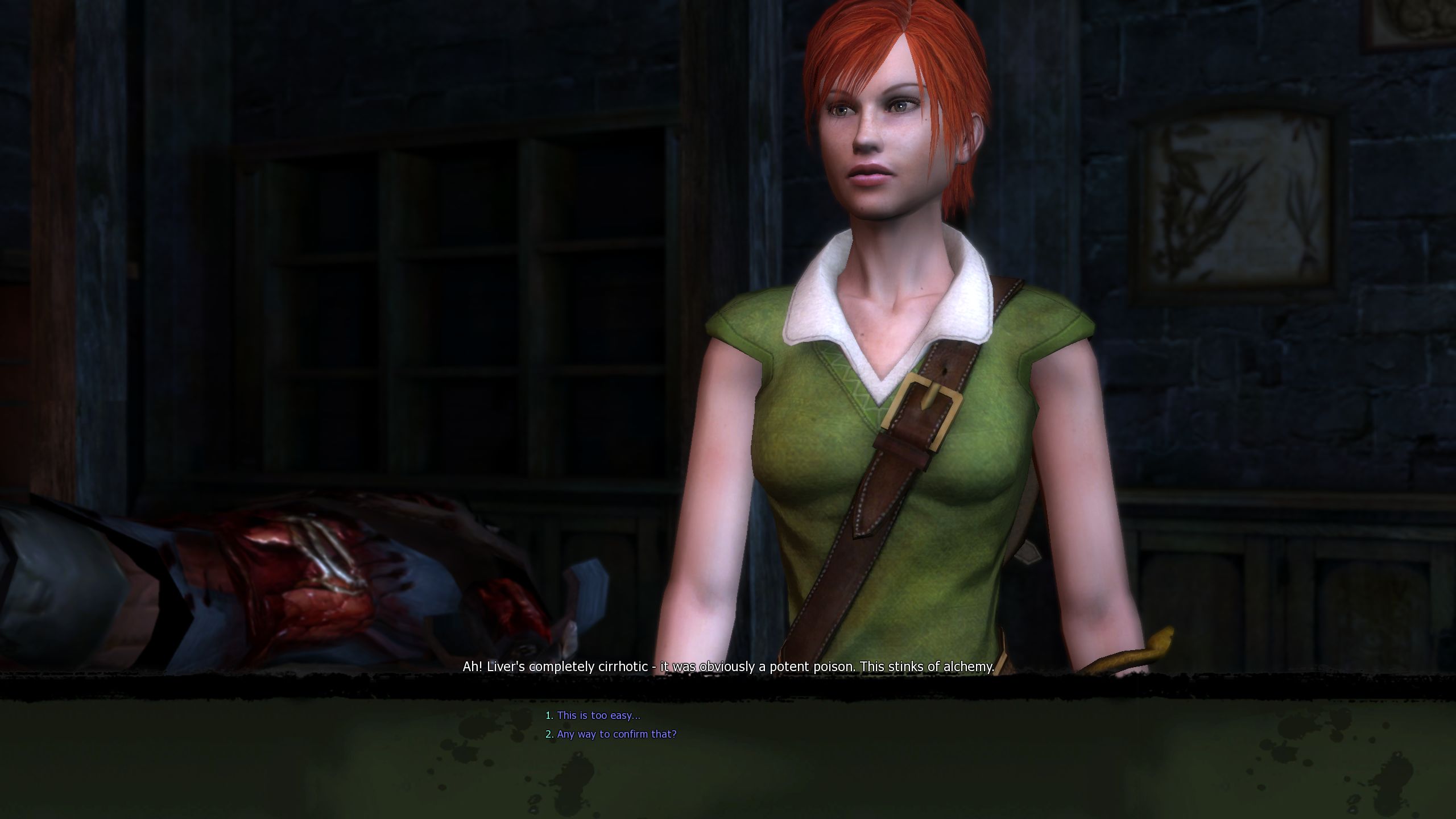 As you can imagine, that solution leaves The Witcher 1’s main quest muddy at best, and unnavigable at worst. In the most egregious instance, I cottoned onto a crucial character deception – but found the game gave me no option to call it out. Only by digging into a wiki did I learn that I’d need to load an earlier save to take the path I wanted to; I’d picked the wrong fork in an innocuous dialogue choice during an autopsy. If you can detect the cataclysmic difference between the two lines below, you’re a better sleuth than I: