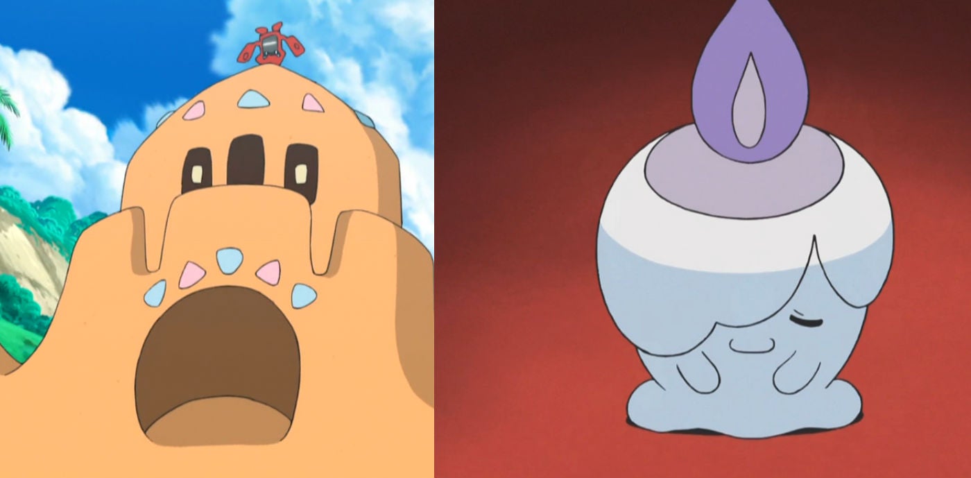 Litwick (Debut: Pokémon X and Y) and Palossand (Debut: Pokémon Sun and Moon)