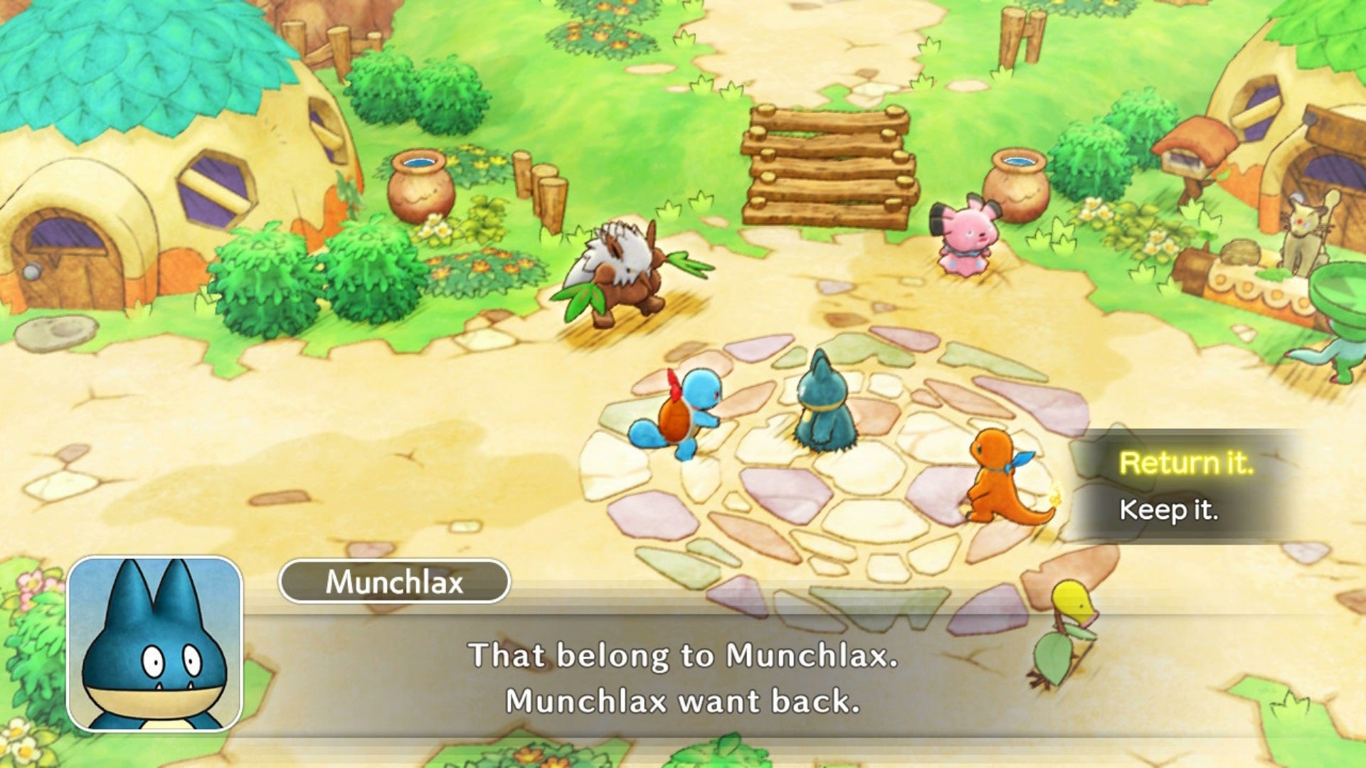 Munchlax is a random encounter that can happen in Pokemon Square, one that triggered for us not long after beating the Mankey and upgrading your team base. It's not a combat encounter - at some point while you're in Pokemon Square, Munchlax will walk across from right-to-left. They won't say anything if you're talking to them, but when they get to the middle of the Square, they'll drop several Apples. Pick them up before they walk over to them, and they'll ask for them back. Now you have a choice: keep the three regular Apples, or hand them over to their rightful owner.