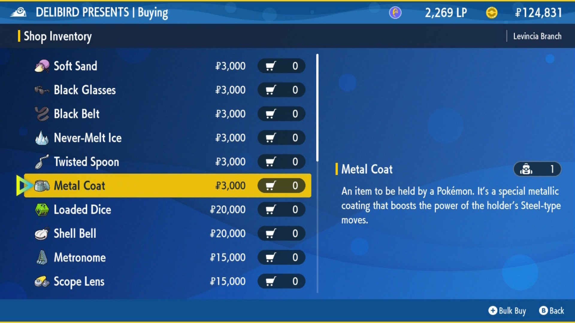 All you need to do is make your way to the city of Levincia. Head to the Delibird Presents here, and under ‘Battle Items’, you’ll be able to purchase as many Metal Coat items as you want for $3,000 Pokedollars.