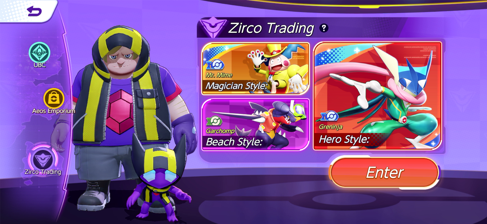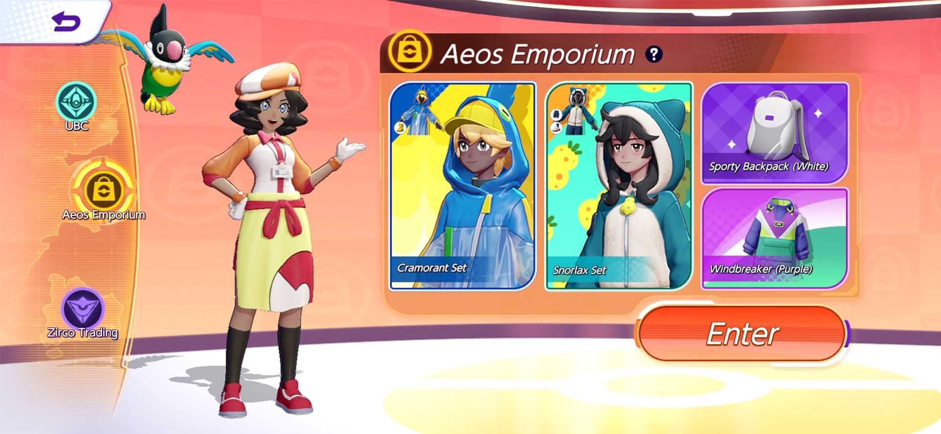 - Obtain Items via Shops - The game has three types of in-game currency: Aeos gems (paid), Aeos coins, and Aeos tickets. Aeos coins and Aeos tickets can be acquired by playing the game. At the Unite Battle Committee, players can use Aeos coins or Aeos gems to obtain Unite licenses, which allow them to take Pokémon into Unite Battles. At Aeos Emporium, players can use Aeos coins or Aeos gems to obtain UBC-approved goods like Pokémon held items or Trainer fashion items (fashion items can also be obtained using Aeos tickets). Zirco Trading specializes in Holowear, which can be obtained using Aeos gems.
