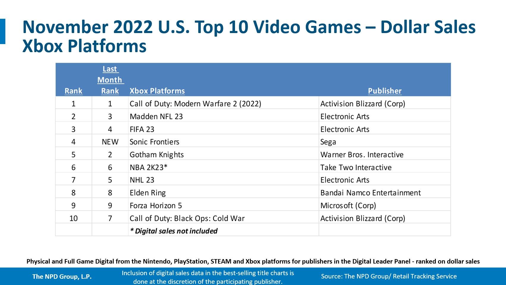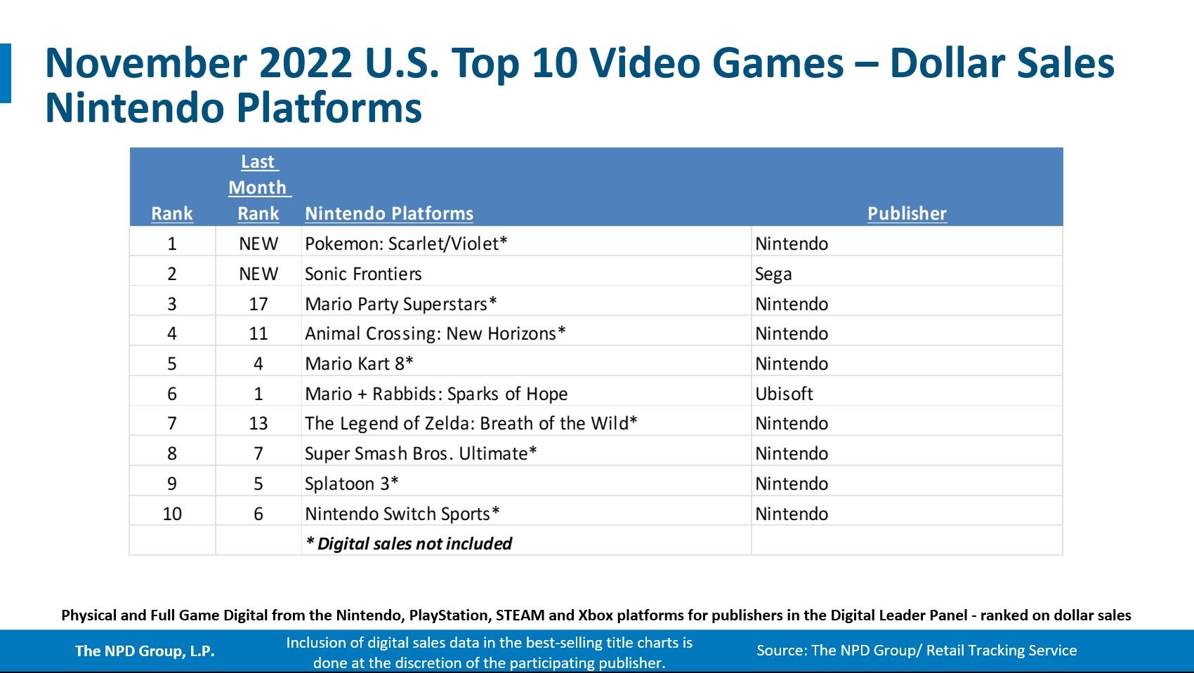 The NPD Group has released its November 2022 report covering video game hardware, software, and accessory sales in the US.