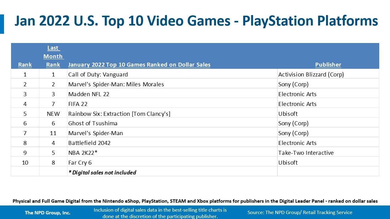 The NPD has released its January 2022 report covering video game hardware, software, and accessory sales in the US.