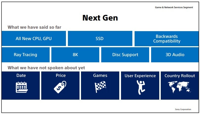 What we don't know Sony highlighted on another slide: the date, the price, the user experience, and release plans. We also don't really know the name - though it seems fair to assume it will indeed be the PlayStation 5. Sony is skipping E3, but hopefully we find out more soon.