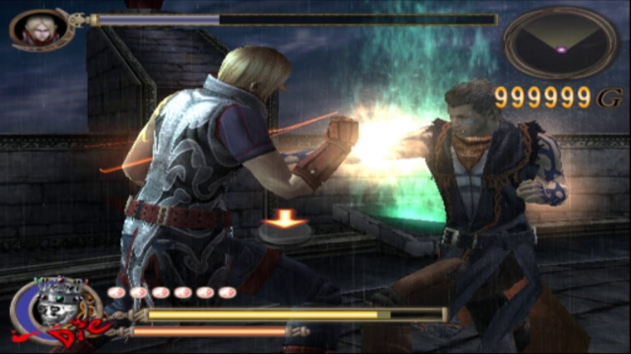Later in the game you meet Azel: the owner of the Devil Hand, which – you guessed it – lets the wielder punch really fast. Since the hands are equals, Azel and Gene have the chance to burst into this flurry at the same time. This leads to that same mash-em-up gameplay, but now with the added context of a struggle to overpower your equal to really see who can punch the best (or mash the fastest). Mechanics, meet narrative.