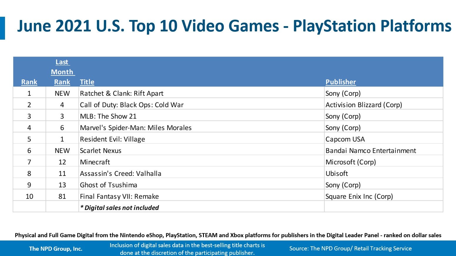 In software, Ratchet & Clank: Rift Apart debuted as the best-selling game for June's best-selling game, and t was the highest launch month dollar sales of any title in franchise history, more than doubling sales of the previous high in the franchise, Ratchet & Clank which released in April 2016.