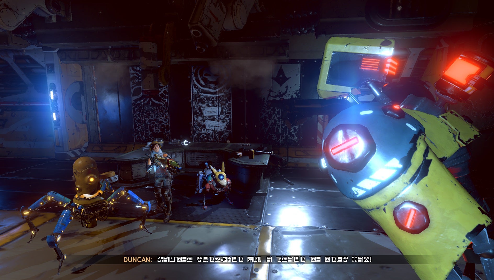 If you're up against a yellow core enemy, you want to switch to the yellow firing mode to do more damage. The same is true of your partners, Mack will do more damage against his fellow blue cores. In addition, each color imparts status effects: blue stuns foes, red lights people on fire, and yellow slows. Combat is a matter of staying away from the enemy and their status effects, while switching to the colored ammo that will do the most damage.
