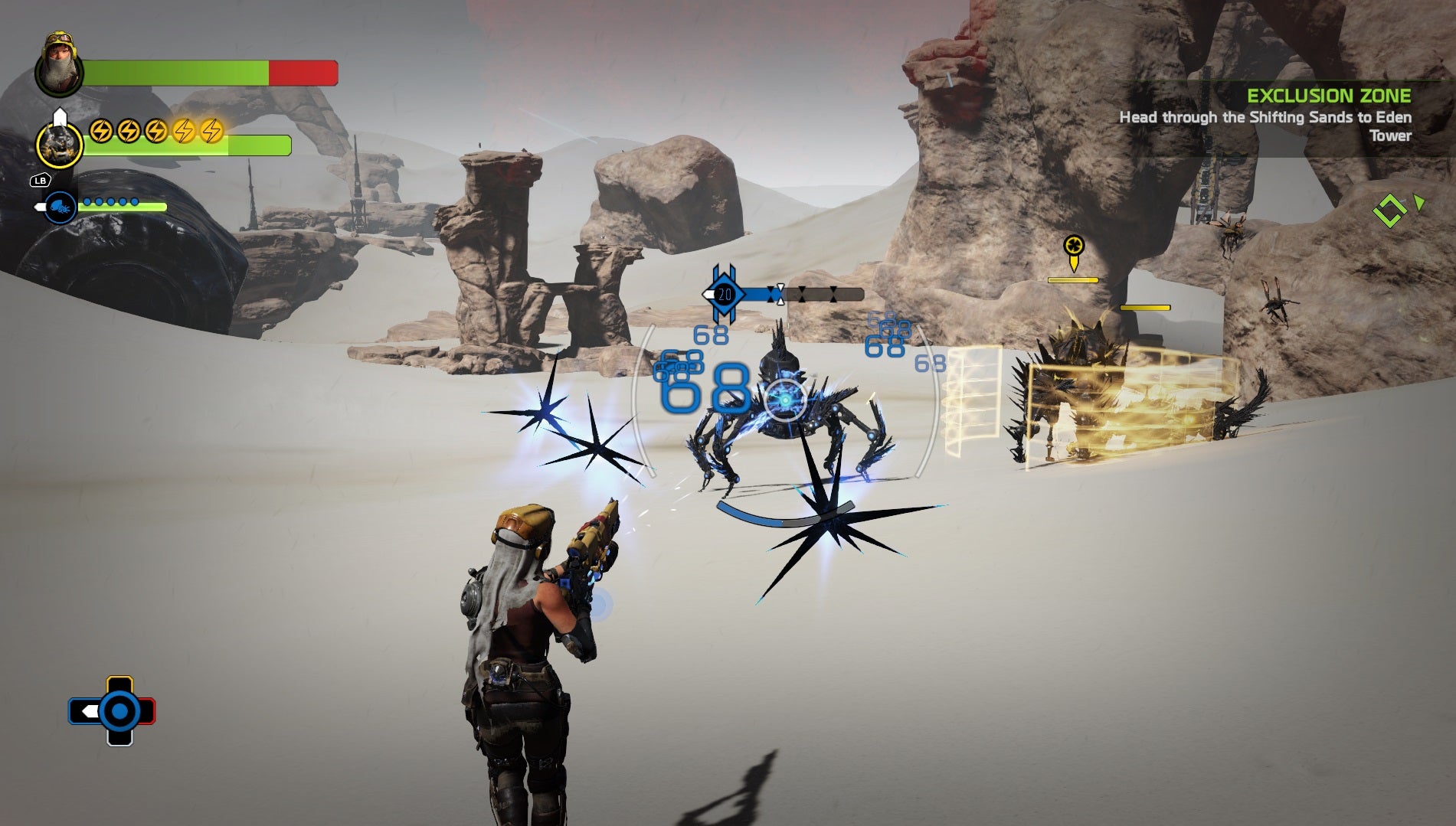 Your charge shot is used to take down enemy shields, opening them up to take more damage. Once you've whittle down their lifebar enough, you an extract their cores with Joule's winch, featuring a tug of war where you have to hold back or risk your line breaking.