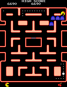 This would be an unusual enough design on its own, but it gets stranger once you factor in the "Pal" referred to in the title. In addition to Pac-Man and the four multi-colored ghosts, a sixth character roams through the maze independently of the player: A strange green ghost with a bow who looks for all the world like Lala from HAL's Adventures of Lolo series. While Pal can't hurt Pac-Man, she doesn't exactly help him, either. Instead, she wanders aimlessly until the player unlocks a room, at which point she makes a beeline for the fruit within and drags it toward the ghost house. If she manages to make it to the ghost house with fruit in tow, it becomes removed from play, robbing the player of precious points to add toward their high score tally and thus denying them arcade fame.