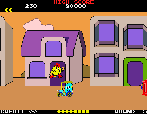 Add to this the added complication of Pal scuttling across the screen with your precious fruit (and even the power-up icons) as you worked to unlock as many barred chambers as possible, and what results was a bizarrely complicated take on Pac-Man's classic maze chase. Despite featuring fewer on-screen objects to deal with, Pac & Pal is far more challenging and stressful. It's also the first Pac-Man game to include background music during gameplay (a necessity given the lack of dots to munch noisily), but it features an almost inappropriately mellow tune in light of the high-stress and sometimes overwhelming design of the game. Interesting, the game's official art depicts Pac-Man wearing headphones, so evidently the music is meant to be what Pac-Man himself grooves to as he explores the maze.