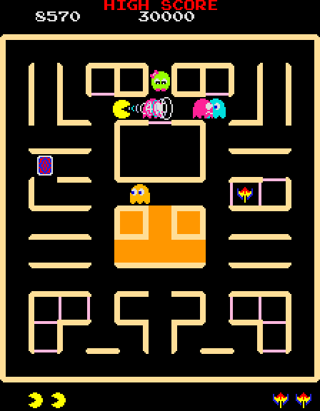 To add one last touch of weirdness to it all, the lack of energizers doesn't quite leave Pac-Man completely helpless. Instead, he can collect the various icons that appear in the boxes flanking the ghost house to acquire the ability to stun ghosts with projectiles. Rather than devouring his foes per usual, he can instead blast them with temporary powers to knock them silly and take them briefly out of the action. The projectile in question varies according to the power-up icon, though they're all functionally equivalent to one another. While a Galaxian flagship fires a Galaga capture beam, a trumpet blasts a burst of sound, and the Rally-X racer lays down a puff of smoke, they all stun ghosts the same.
