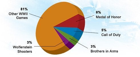 Brothers in Arms made up 3 percent of the WWII games, with Call of Duty 5 percent, Medal of Honor 8 percent, Wolfenstein 3 percent, and 81 percent were miscellaneous titles.