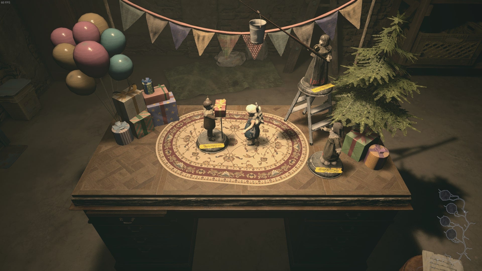 You’ll want to place all three dolls on this table, but their positions are not labelled. Place the Jimmy’s Room doll so that it is holding the gift, position the Catherine doll at the base of the stepladder, and then the Lucy doll at the top of the stepladder.