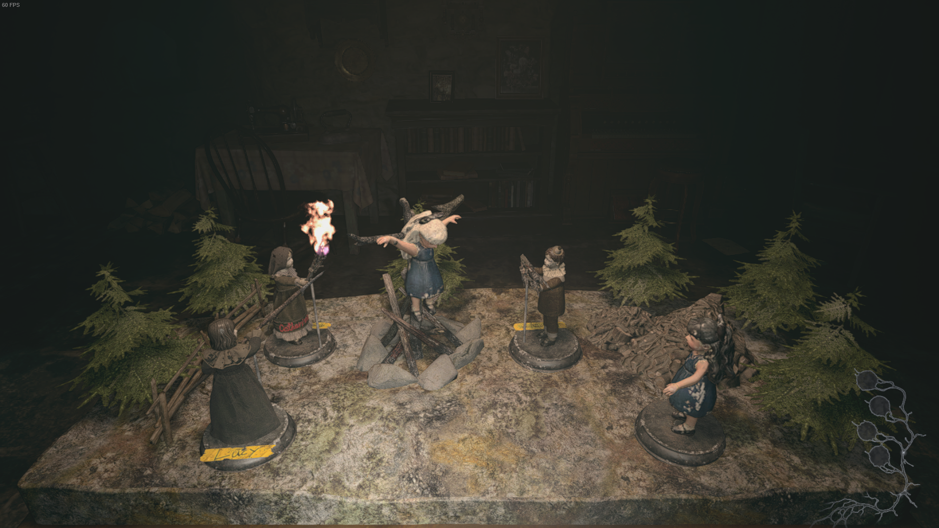 On the unlabelled platform, place the new Black-haired doll. There will be a platform to the left labelled ‘Lucy’, so place the Lucy doll here. Place the Jimmy’s Room doll so that he is in the remaining platform that faces the doll who’s on the stake here, and place Catherine in the remaining spot.