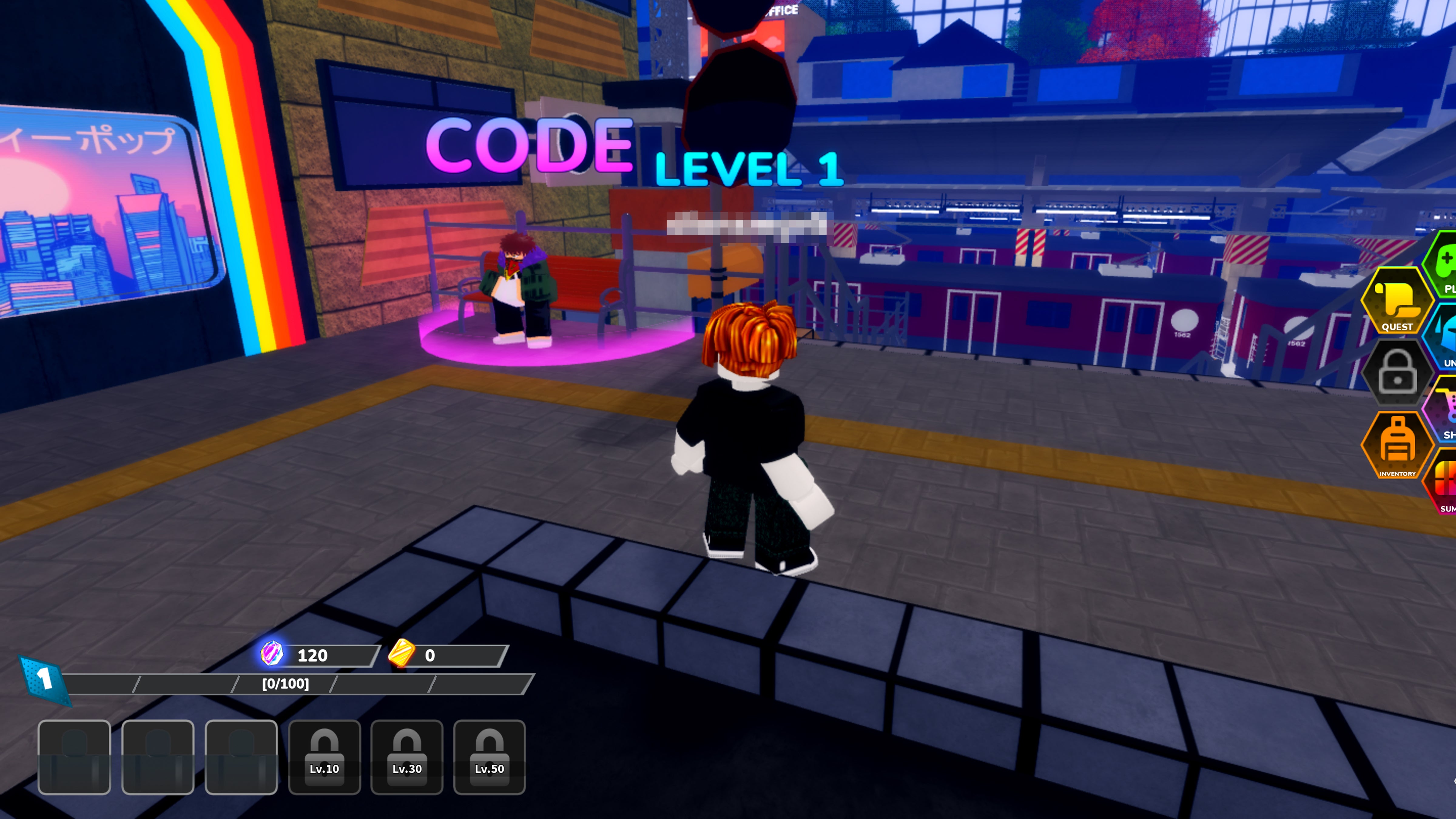 - Walk past this building to find a character sitting on a bench with 'Code' floating above them.