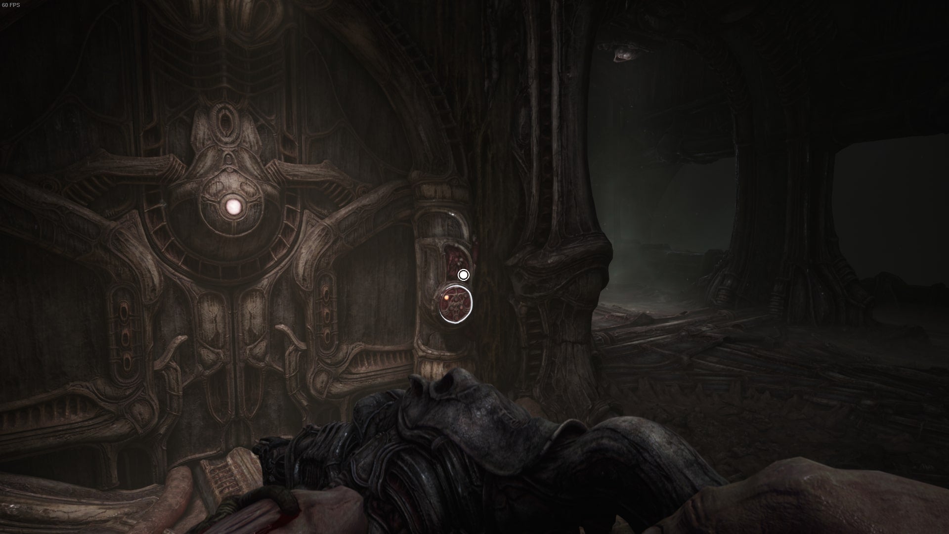 Now, you’re essentially back where you started. What we want to do is return to the two-handed pillar that had the corpse attached to it from earlier. From here, go back to the room illuminated with red light and take the lift. Then, follow the rooms round until you reach the tunnel with the button contraption inside again, and access the left-most tunnel.