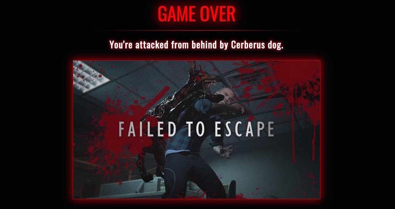 Featuring screenshots from Project Resistance, Capcom's asymmetric multiplayer spin-off of Resident Evil, the browser game is as dead simple as they come. You start by deciding whether you enter an Umbrella facility alone or with friends. Each new screen presents you with 2-4 choices, some of which do seem unnecessarily risky (why try to run past a camera or shoot a booby trap rather than sneak by?), but when you fail you just fail, miserably and out of nowhere.