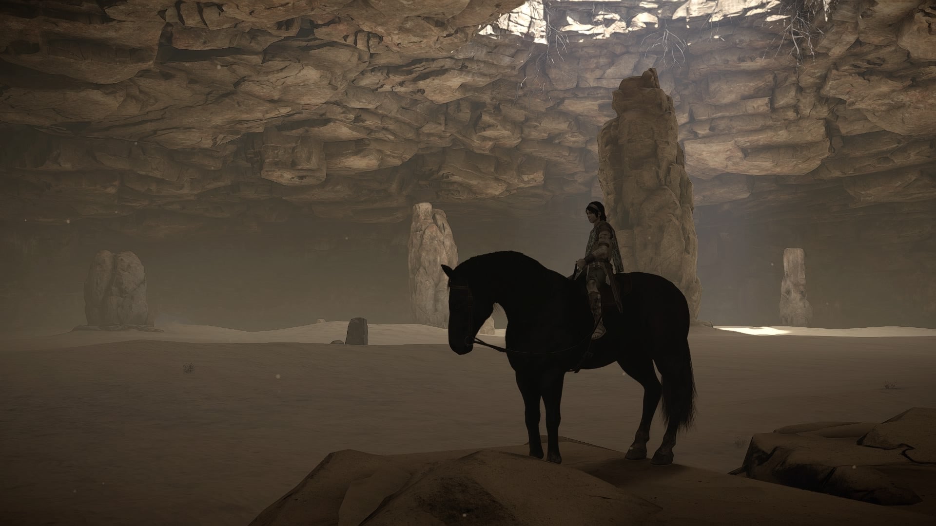 Enter the cave staying on your horse, and ride into the center where the light beams through the ceiling. You will meet the tenth Colossus, a giant sand worm.