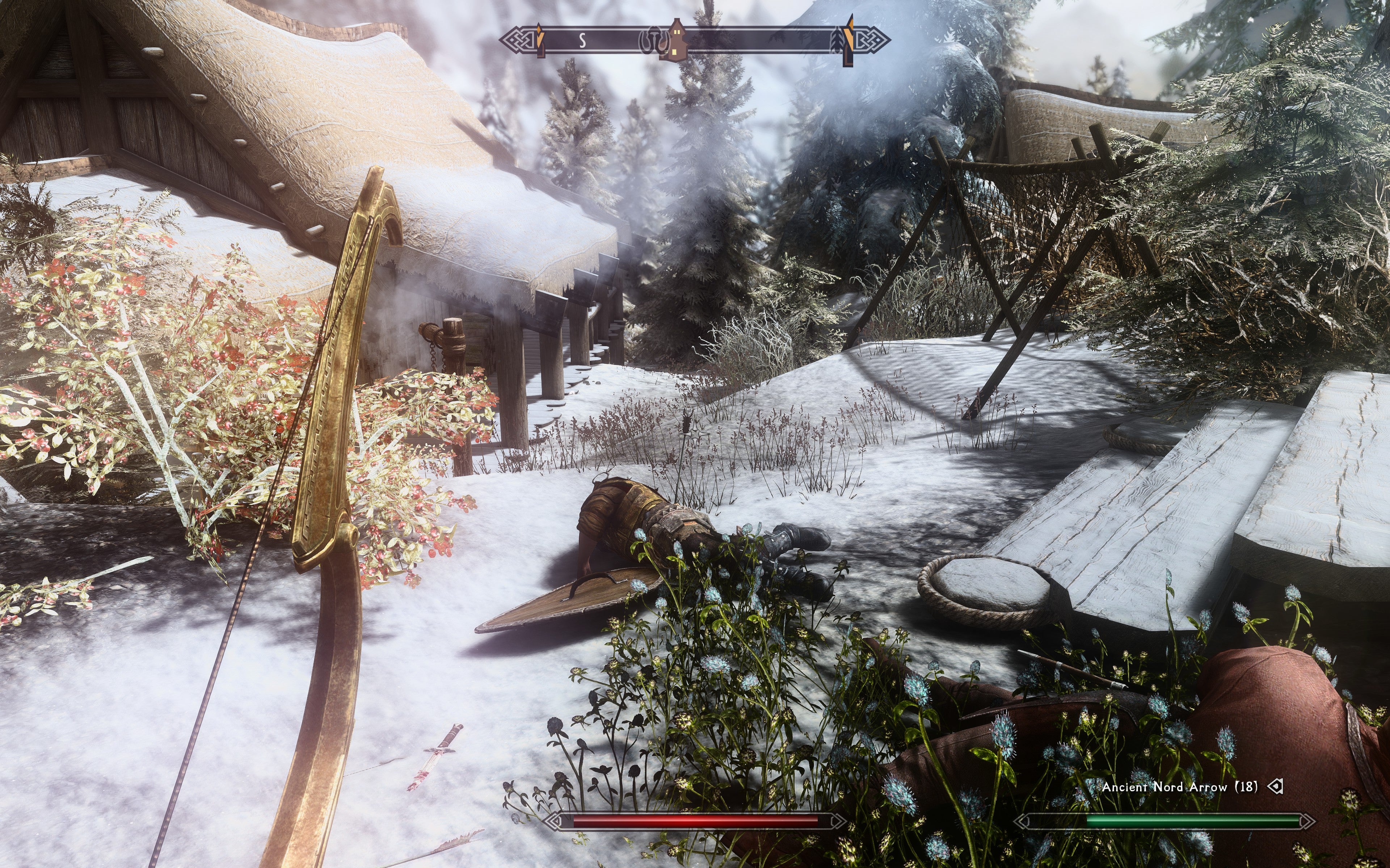 You crest a hill, and you see something you just have to investigate. You come across an upturned cart, a dead horse, and a man with a suspicious smile standing in the road, and you understand there’s been some form of highway skullduggery at foot here. You journey back to Riverwood time after time, just because it looks nice. That’s in part why modders felt so inspired to keep building on the world and improving it, bringing it to life in ever-more vivid detail over the years.