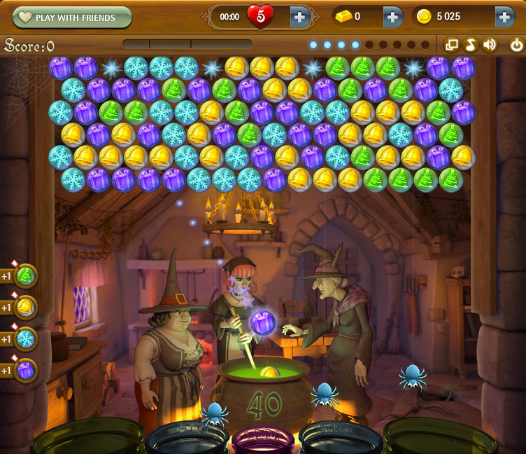 What is it? A game in which you fire colored bubbles out of a cannon in an attempt to make groups of three or more adjoining like-colored bubbles. Popping bubbles in such a manner that other bubbles are no longer attached to the top of the screen causes them to fall, and the objective in each level is to reveal a certain number of stars at the top of the screen, after which the remaining bubbles all fall into pots at the bottom of the screen.