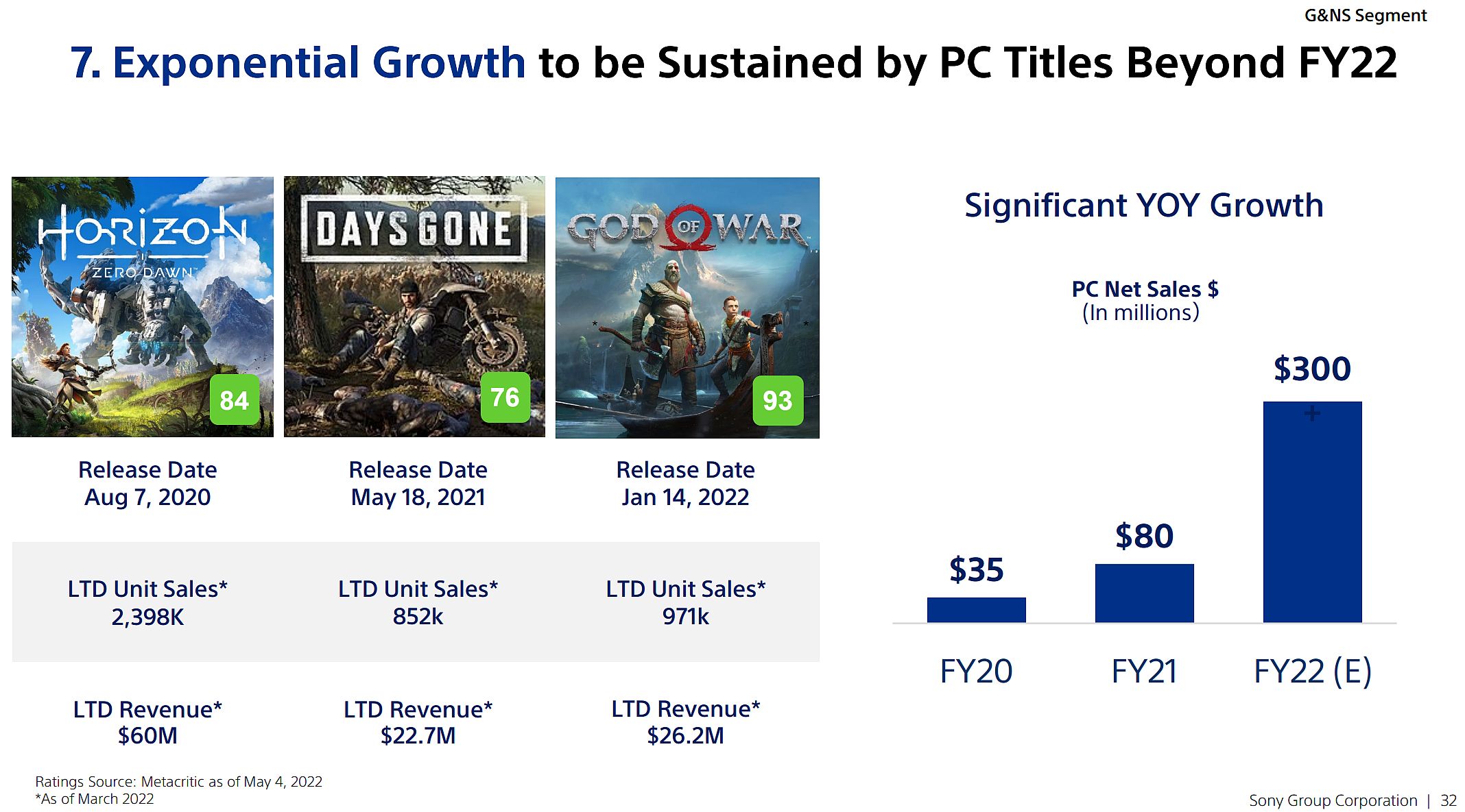 In a financial briefing, Sony said it expects exponential growth to be sustained by PC titles beyond its current fiscal year. PC revenue for the firm has climbed year-over-year from $35 million in 2020 to $80 million in 2021. It expects to hit $300 million by the end of FY 2022, which ends on March 31, 2023.
