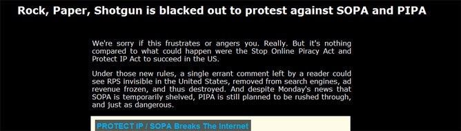 "Under those new rules, a single errant comment left by a reader could see RPS invisible in the United States, removed from search engines, ad revenue frozen, and thus destroyed. And despite Monday's news that SOPA is temporarily shelved, PIPA is still planned to be rushed through, and just as dangerous."