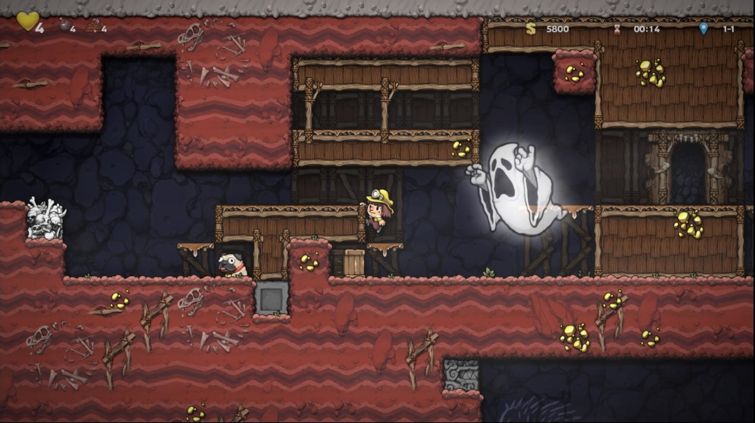 One new item that's instantly soured many of my runs is the Ghost Pot. As before, there are lots of jars and pots strewn around Spelunky's levels that can include gold, jewels, or the occasional enemy. Each level is also guaranteed to have one Ghost Pot—the first time I broke one open, I was delighted to find a diamond inside. It also summoned the Ghost, a seemingly invincible enemy that will stalk and kill players if they take more than a few minutes to complete a level. I've had a few runs come to an abrupt end because I fired a shotgun off-screen, only to realize I broke one of those pots and brought damnation upon myself.