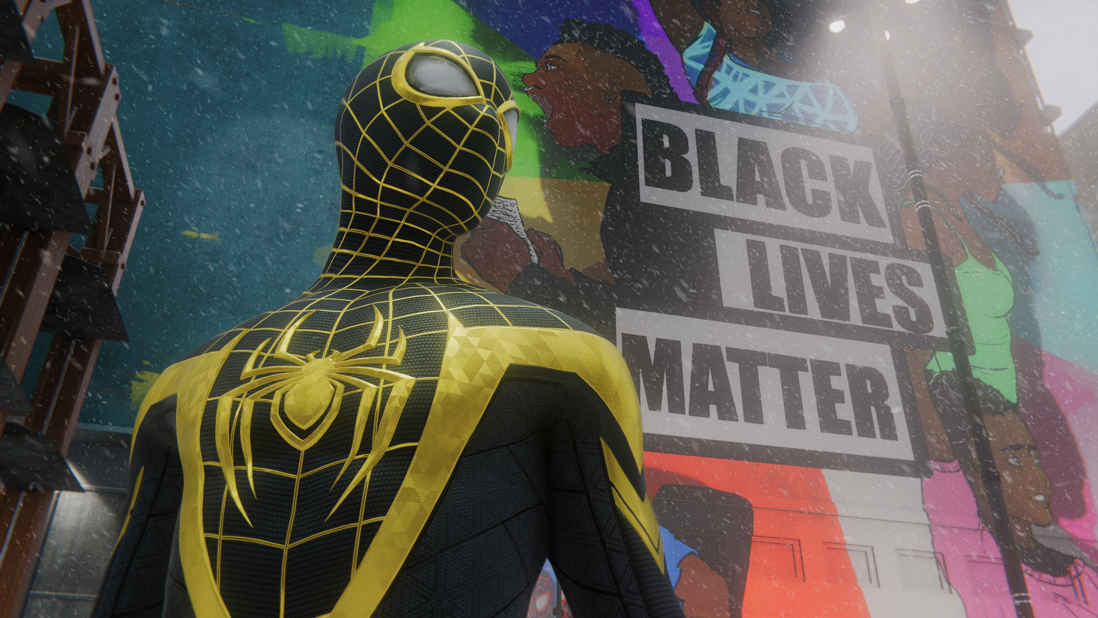 When you get the suit, a cutscene plays that introduces the suit with heroic camera angles, settling on a camera angle that has Miles' Spider-Man in the foreground and a huge Black Lives Matter mural painted by the people of Harlem in the background.