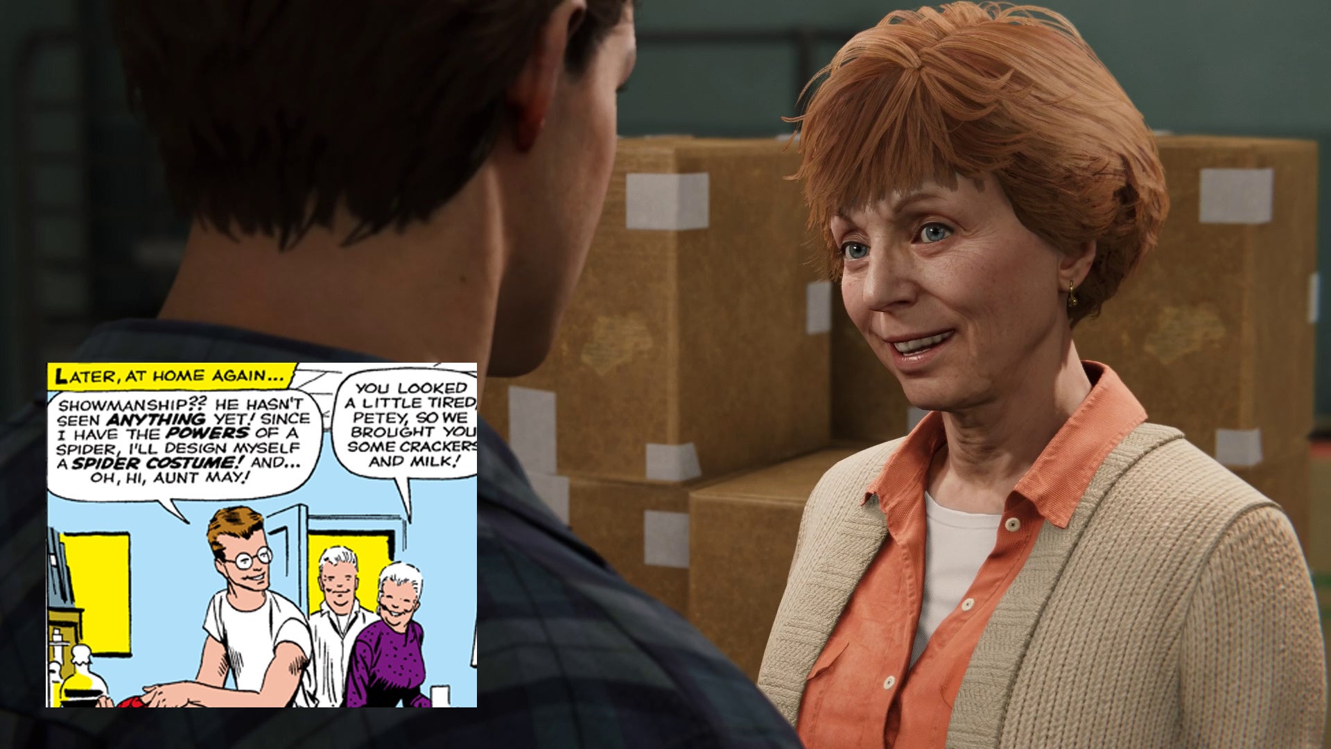 Aunt May is Aunt May, regardless of reality. Sometimes she's younger, sometimes she's not. In Marvel's Spider-Man, she's working at Martin Li's F.E.A.S.T. shelter, like her comic version did at one point.