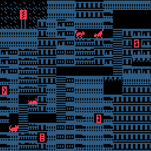 The brief Bitsy-constructed game A Cat in the Walled Kowloon reimagines the historical area in a fresh way: by relegating it to 8-bit. The player controls a puny 8-bit feline in search of a place to nap, directing the cat all across the stairs among the labyrinthine city. The kitty meets friends along the way: napping cats, fighting cats. The palette of the world changes with every screen, from navy to mustard. After a couple minutes, the cat finally reaches that perfectly dry and clean place to rest its head.