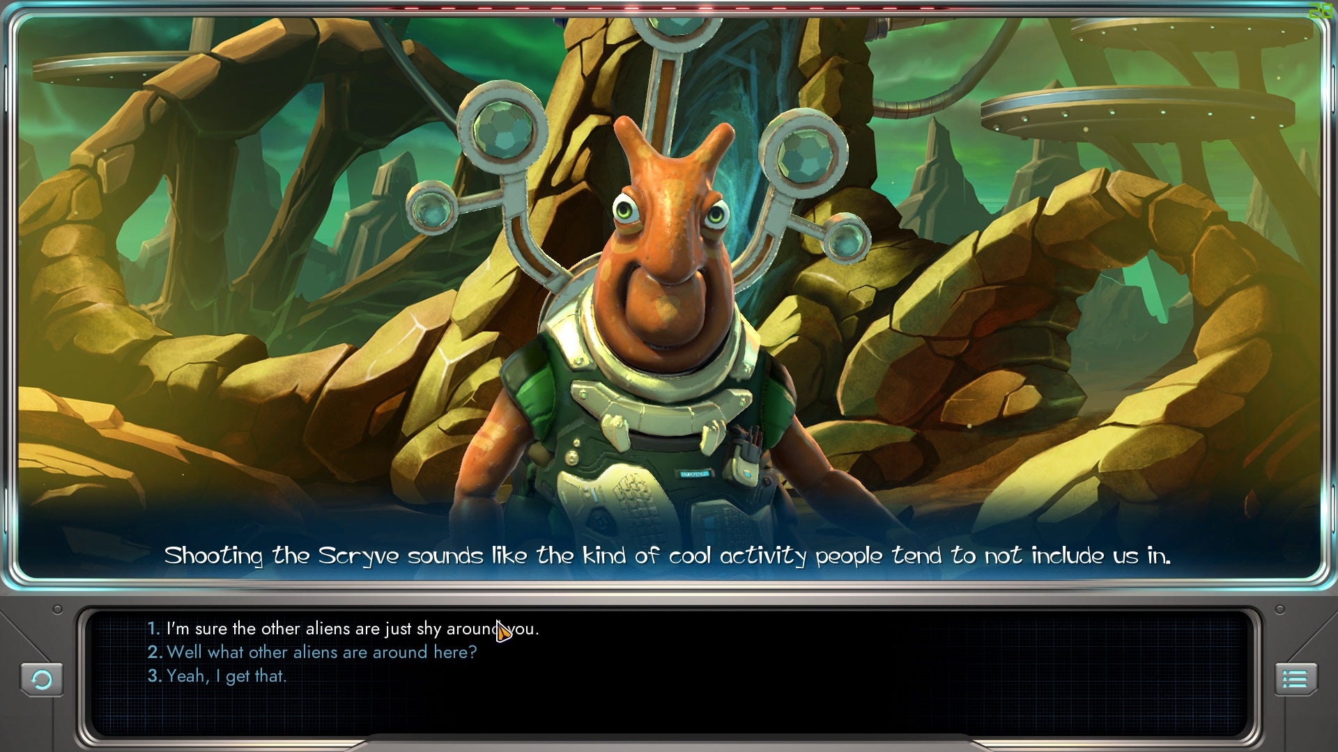 Those aliens are pretty broad in terms of characterization—once you've met one Tywom, you've met them all—but they're all fun in an early Trek way. The main thrust of the story campaign is the looming threat of the warlike Scryve, a brusque race wearing ornate armor. You'll meet others, like the warbound Drenkend, who were very happy to tell me how good they were at dying. I met them trying to protect the Mu'Kay, an aquatic race who formed a Federation of one and do their best to stay out of all conflict. There's even the broken Starbase AI, which is present in every floating outpost and was apparently never programmed to give a civil farewell.