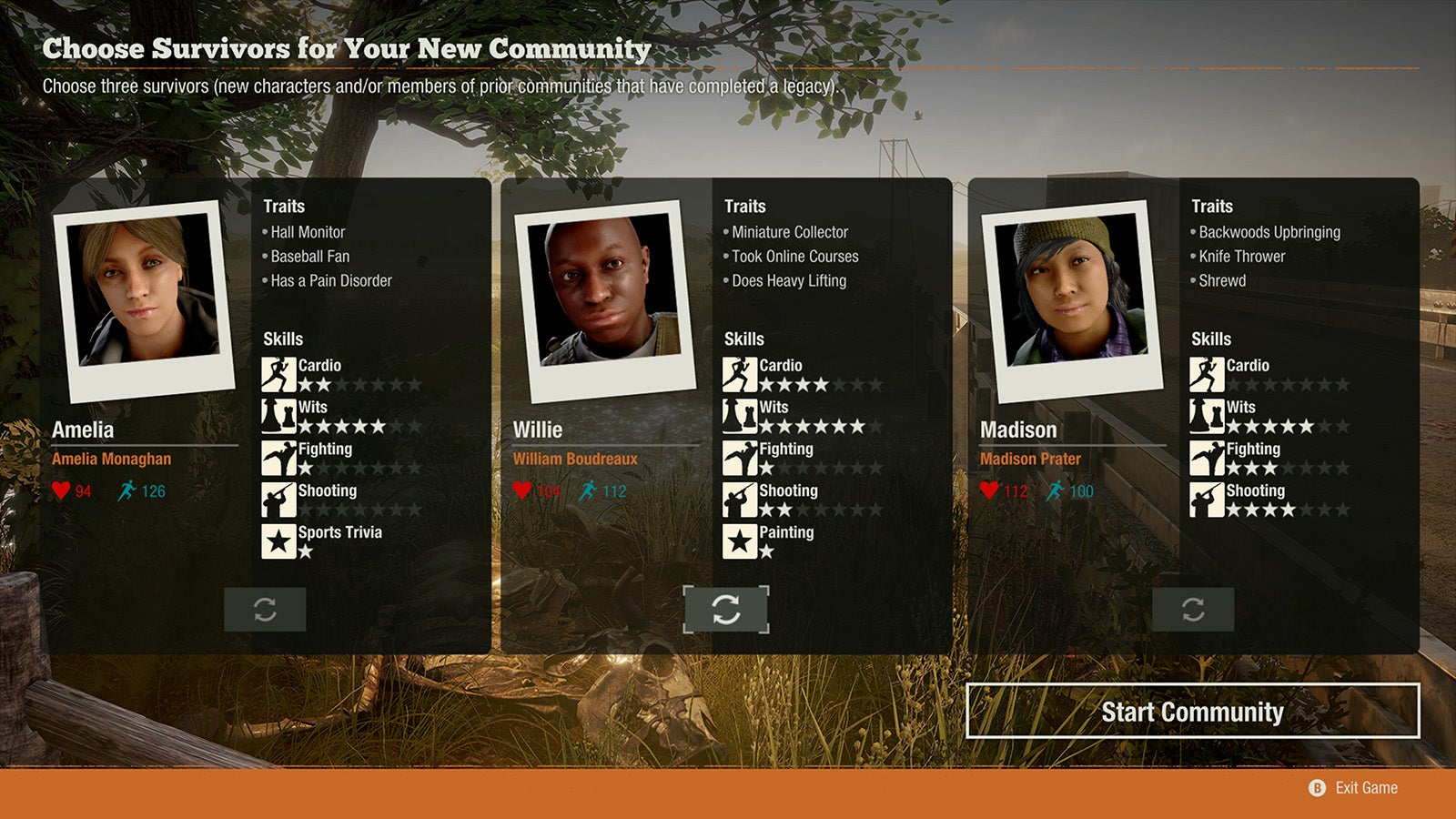 Nothing could dissuade me from satiating my ever-growing community, from my upgraded base to my many outposts. With every perilous expedition out I made for supplies like food, my community persisted in the desolate zombie-overrun towns. And like all post-apocalyptic fiction, my team was heavily diverse in every way possible. As for their unique character traits, one was a "Halo Champion" (I'm guessing in their previous life), while another was "Into Ultimate Frisbee" and had solid "cardio" skill to match. In addition to sillier traits, every character has a variety of strengths and weaknesses too.
