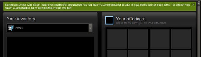 Screen grabs of the safety measure were posted on Reddit, along with a message that states users will be unable to use Steam Trading unless they have Steam Guard active for 15 days prior to the trade.