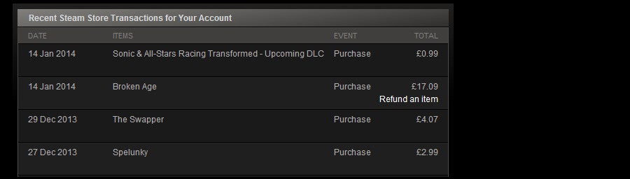 According to a detailed post on Valve Time, unreleased pre-purchased titles listed on the user's Steam Account page will have a "Refund This Item" button located beneath the item's price.