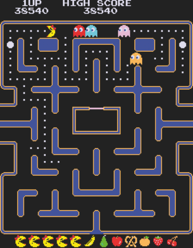 The obvious problem with Pac-Man was the predictability. People understood that it was going to play the same way every time, so what could we do to change that? The Z80 microprocessor had this free-running counter inside of it called the refresh register, because it was designed to be used for D-RAM refresh. But you could access it from software and read the value of that counter, so essentially it's a random number generator. And we thought how could we use that to add randomness to the game. Looking at the existing AI of the monsters, and realizing that there's this one mode they're in where they run to a fixed spot in the maze that's predefined. So why not have them head to a random location? That was the key to changing the monster AI. It was enough, particularly at the lower levels, because they're in that mode quite often, and it changes their behavior enough to totally throw off their patterns. The monsters are still a little bit predictable in their behavior, particularly when they're chasing you, because we didn't change that at all, so they'll chase you in the same way, but it screwed it enough so patterns wouldn't work any more.