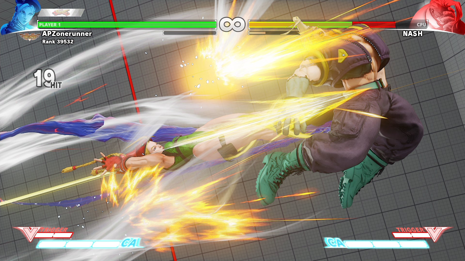 Cammy dashes across the screen at speed in a drill-like fashion. The harder the kick button used, the further she travels, with the Hard Kick version having two hits. The EX and V-Trigger versions pass through projectiles, too, an ideal way to catch careless fireball spammers off guard.