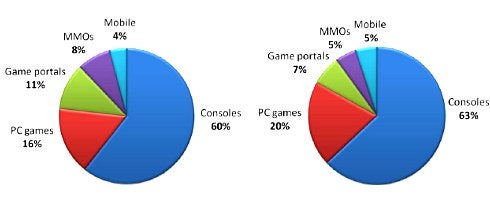 In the UK, the amount spent on consoles/handhelds was 63 percent, 20 percent for PC, 7 percent for online portals, and MMOs and mobile gaming tied for 5 percent of money spent.