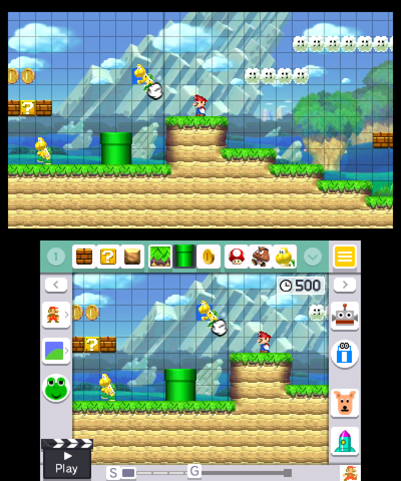 The real question has to do with the trimmings. Sure, 2D Mario challenges play wonderfully on the 3DS, but what about the process of creating 2D Mario challenges? The touch-driven editing interface, so luxurious on the chunky Wii U game pad, have to work on the 3DS's lower-resolution screens — or rather, screen. The smaller, DS-resolution touch-enabled bottom screen. Not only does this provide players with a far more cramped physical space, it also means you have nearly 90% fewer pixels to work with. By all rights, it should be a disaster.