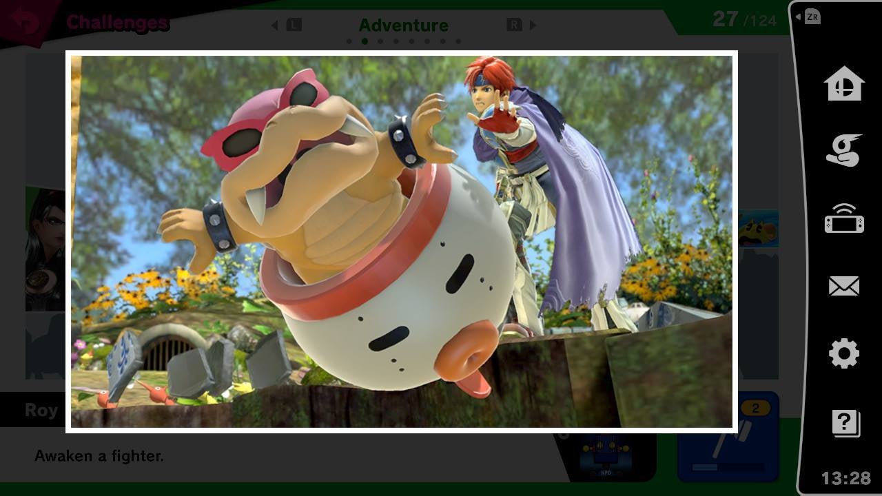 Either way, Smash Bros Ultimate is an exquisite gallery of visual humor. By completing "Challenges" (i.e. getting Achievements) you unlock pictures that use the game's characters as models in dioramas. Some pictures just show off the characters in dynamic poses, but many relay jokes. For example, one of the first pictures I unlocked shows Roy from Fire Emblem pushing Roy from the Super Mario Bros series off a ledge. There can be only one.