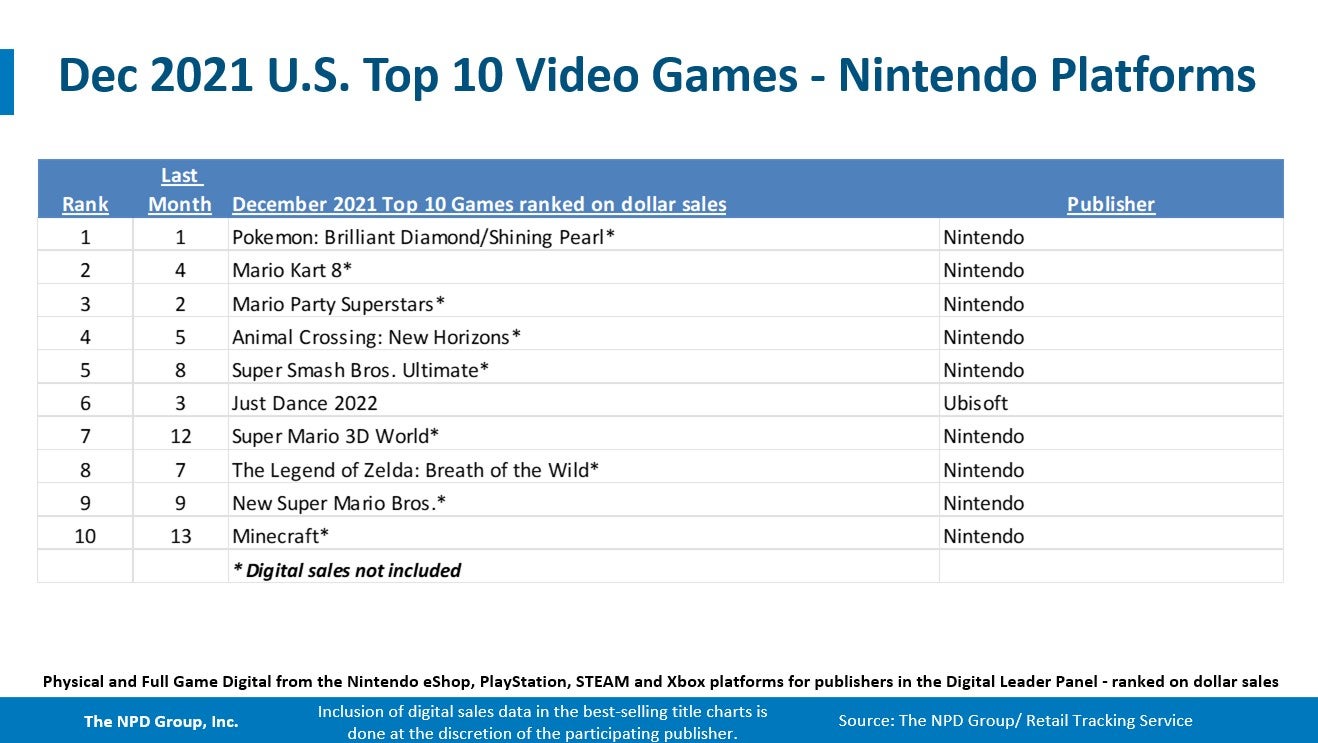 Pokemon Brilliant Diamond/Shining Pearl was the third best-selling title of December, followed by Madden NFL 22 and Battlefield 2042 rounding out the top five. Resident Evil: Village finished the year as the eighth best-selling game for the month.