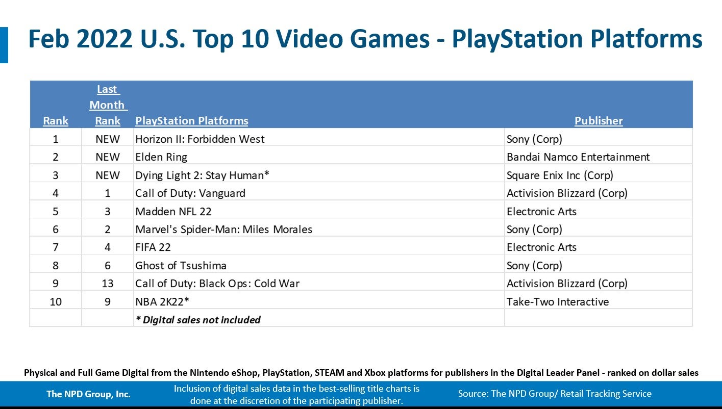 PlayStation exclusive Horizon Forbidden West was the second best-selling game for the month and was the best-selling game on PlayStation platforms. Dollar sales of the PS5 version set a new launch month record for the console.