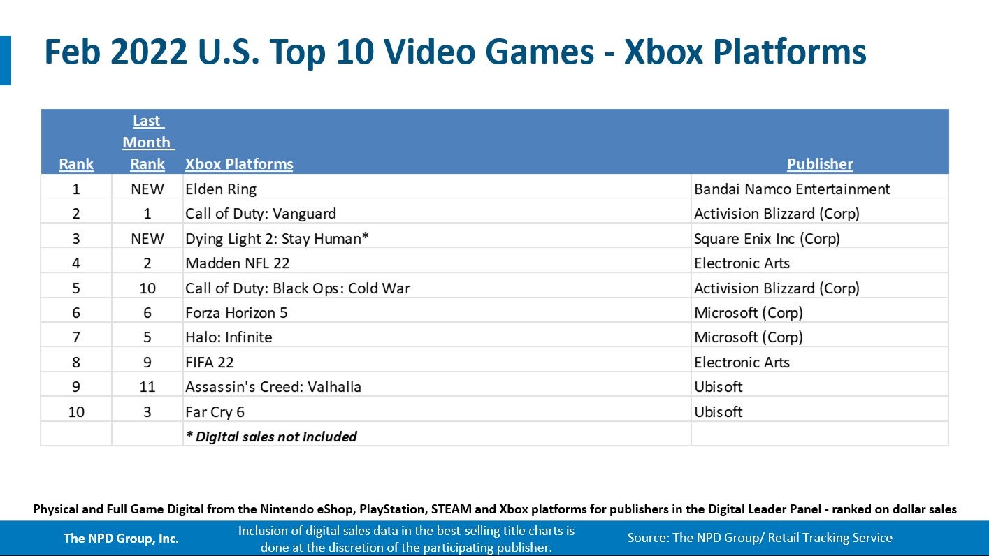 In software, Elden Ring debuted as both the best-selling game of February 2022 as well as 2022 year-to-date. Launch month sales of Elden Ring were the second-highest for any tracked title released in the past 12 months, trailing only Call of Duty: Vanguard. In its second week of availability, Elden Ring is the fifth best-selling game for the 12-month period ending February 28, 2022. Elden Ring ranked first on Steam and Xbox platforms in February, while placing second on PlayStation.