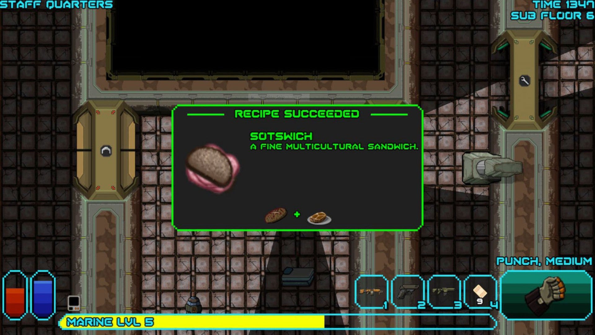 In traditional fantasy roguelikes, experimentation often comes in the form of unidentified potions and scrolls that have randomized effects. In most cases, you will never know what these things do unless you just try them, after which you will either have died an embarrassing death, or you will know what they do. The Pit's take on this mechanic comes in the form of colored weapon modifications, the exact function of which varies from game to game. They tend not to be so brutal as to kill you outright, but there's no guarantee that they'll have a positive effect. In my last playthrough, for example, I applied a mod to my pistol that made it louder and significantly more likely to attract the attention of security systems without providing any particular benefits. I was then stuck with it. Harsh but ultimately fair; I took the chance, and it didn't pay off.