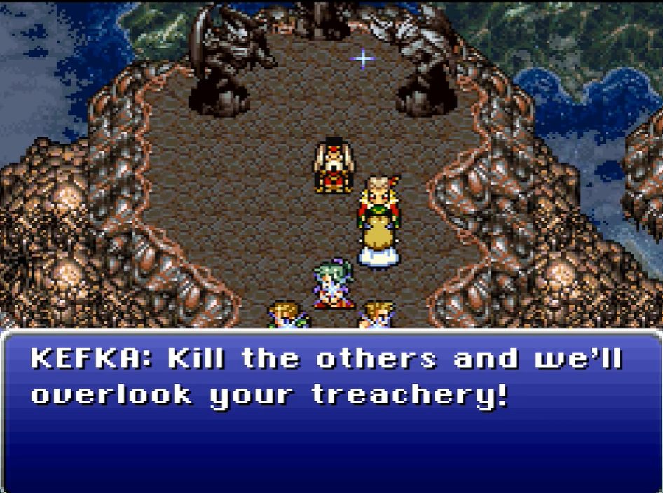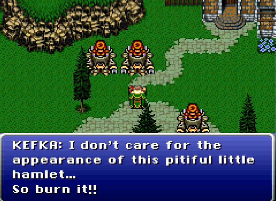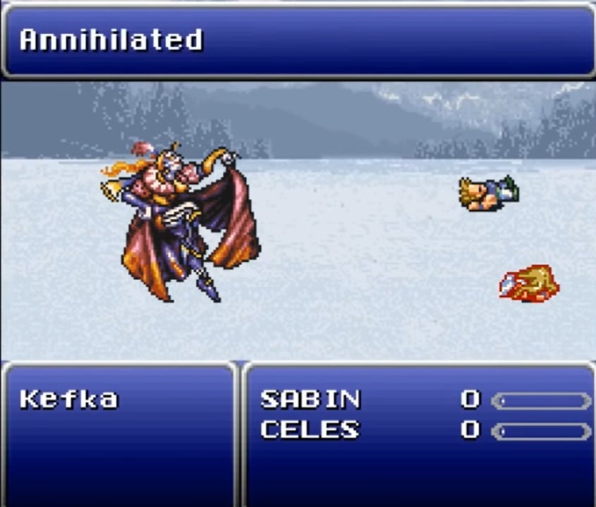 We see poor little NPC character sprites get stabbed, choke on poison, fall into chasms, and even get squished between tectonic plates when a piece of earth heaves to life and launches skyward. But they're not dead. They're "doomed." They've "passed on." When your party falls in battle, they're "annihilated." It was OK for Final Fantasy 6's translation to suggest the party had been obliterated. What matters is they didn't "die."