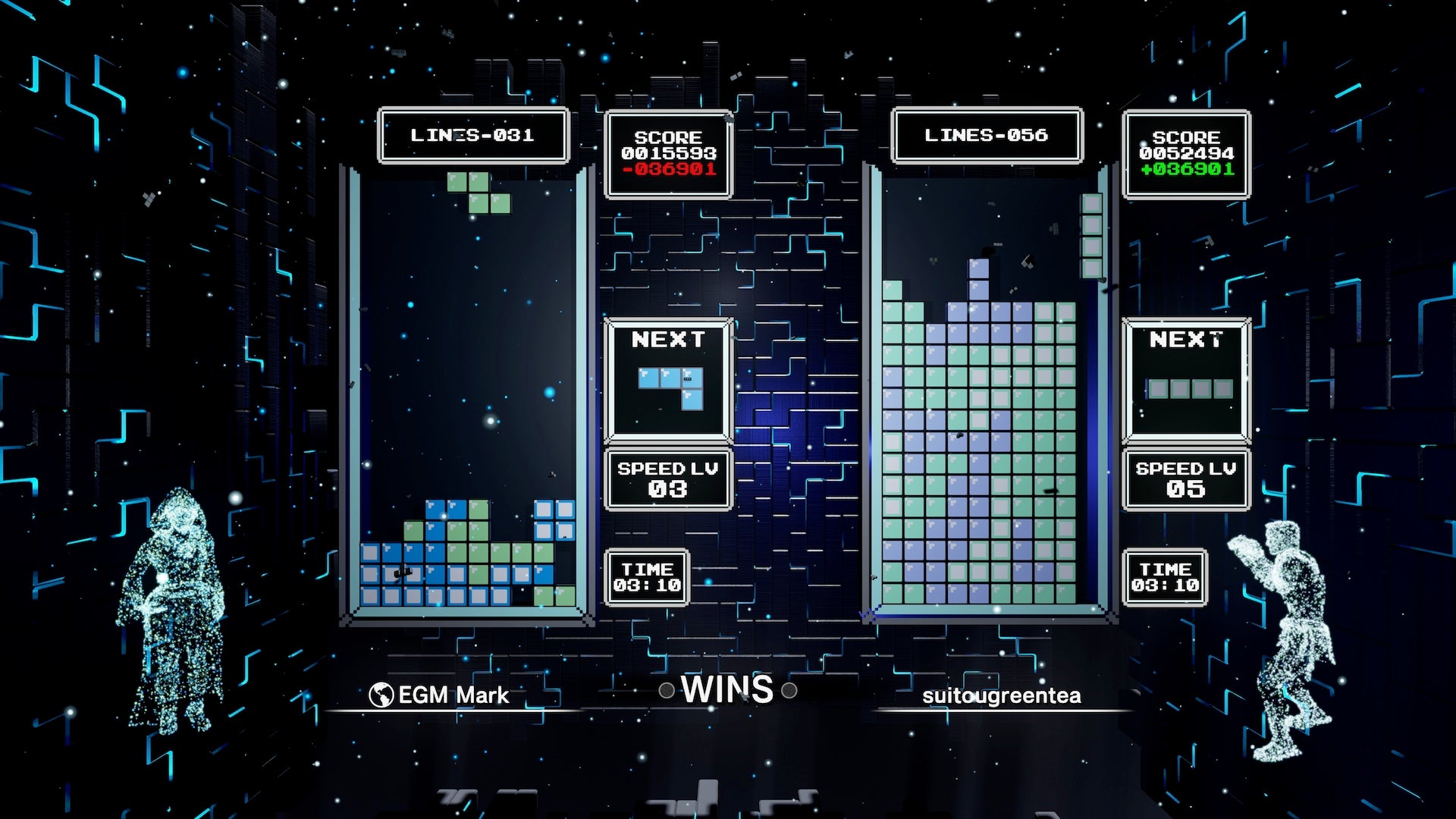What I wasn't expecting from Tetris Effect: Connected are its competitive Score Attack modes. The standard Score Attack embraces modern, Zone-free Tetris rules (holds, T-spin bonuses, etc.) and gets rid of sending garbage to the other player. Whichever player has the highest score at the end of the game is the winner.