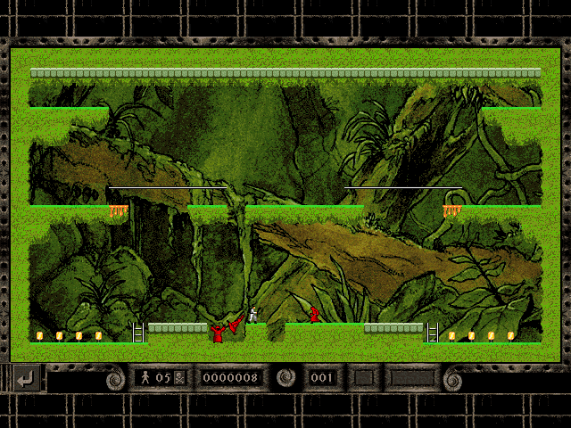 But trapping offered only a brief respite; a destroyed enemy would immediately regenerate elsewhere in the maze, sometimes appearing in the worst possible place. Taking the lethal approach was by no means a guaranteed solution. And your ability to create pits acted as a double-edge sword: Your lode runner (so called because his mission was to run around collecting piles of gold) could just as easily fall into the gaps you created... and unlike the Bungelings, you couldn't extricate yourself. You could easily become your own worst enemy